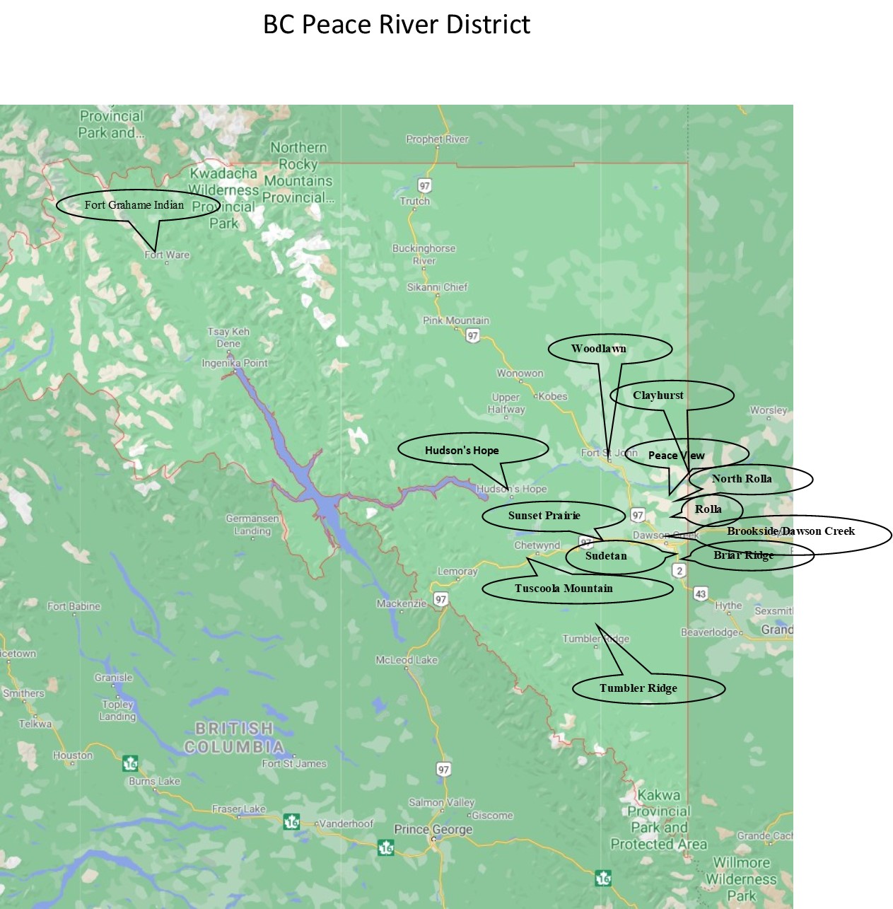 of Peace Cemetery Community: Hudson's Hope Township: SE 30-81-25 W6 Locality: Peace River Province: BC GPS: 56.048018,-121.88983 |